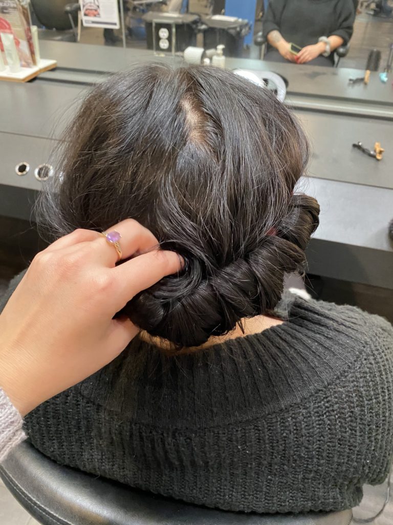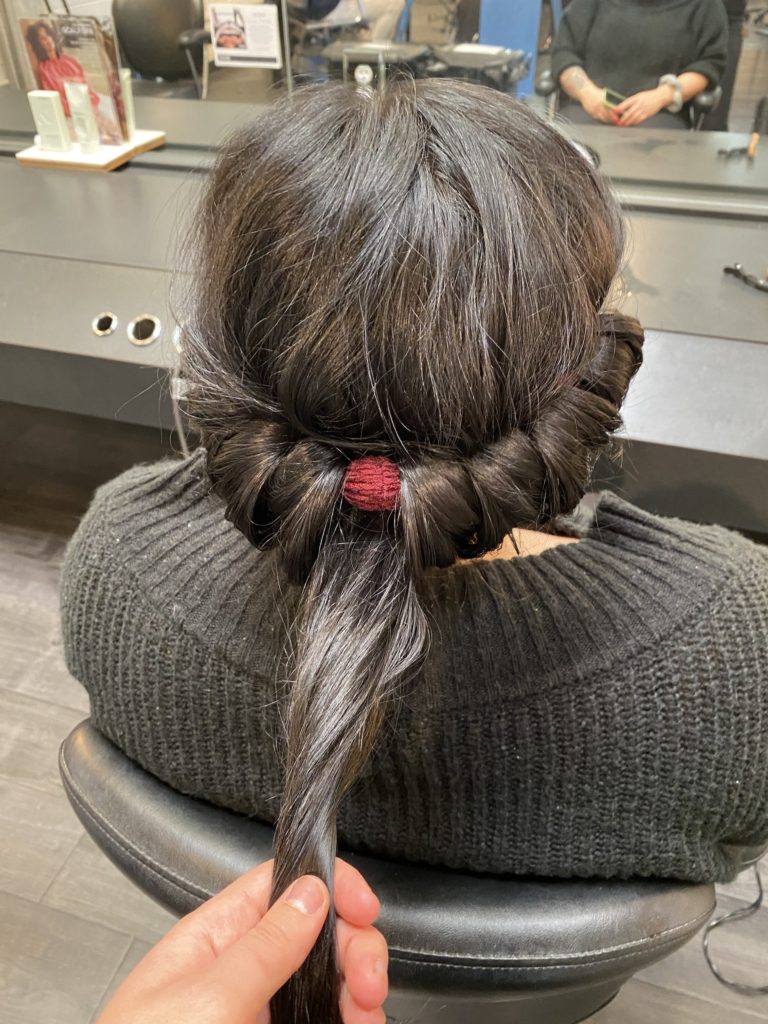 Take note as to where you would like more volume or texture and apply KM’s Powder.Puff to those areas, rubbing it in with your fingers. This will add weightless powder that will help boost any flat pieces in your hair. Take the pieces of hair near your face and wrap them into the headband.