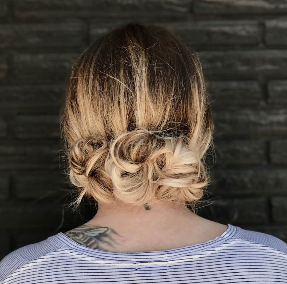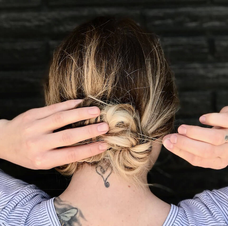 Step 7: Pin each pony up into a messy bun. Keeping them close together so they look like one. Set with either straight pins or bobby pins.